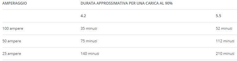 La durata necessaria per la ricarica varia in funzione della temperatura e delle caratteristiche del caricabatteria. Se si usa un caricabatteria a voltaggio costante, la corrente si abbasserà durante la ricarica. Quando la corrente diminuirà a meno di 1 ampere la batteria sarà quasi completamente carica.